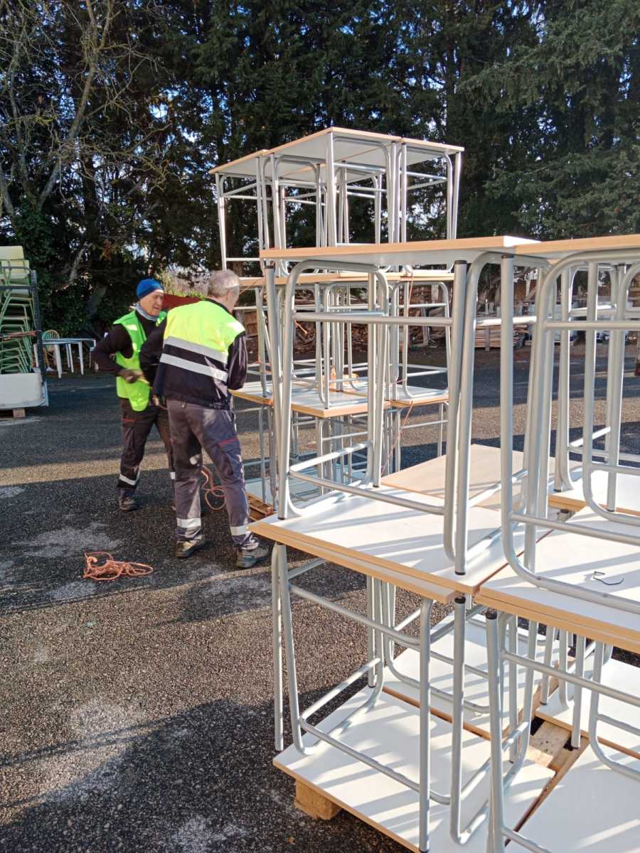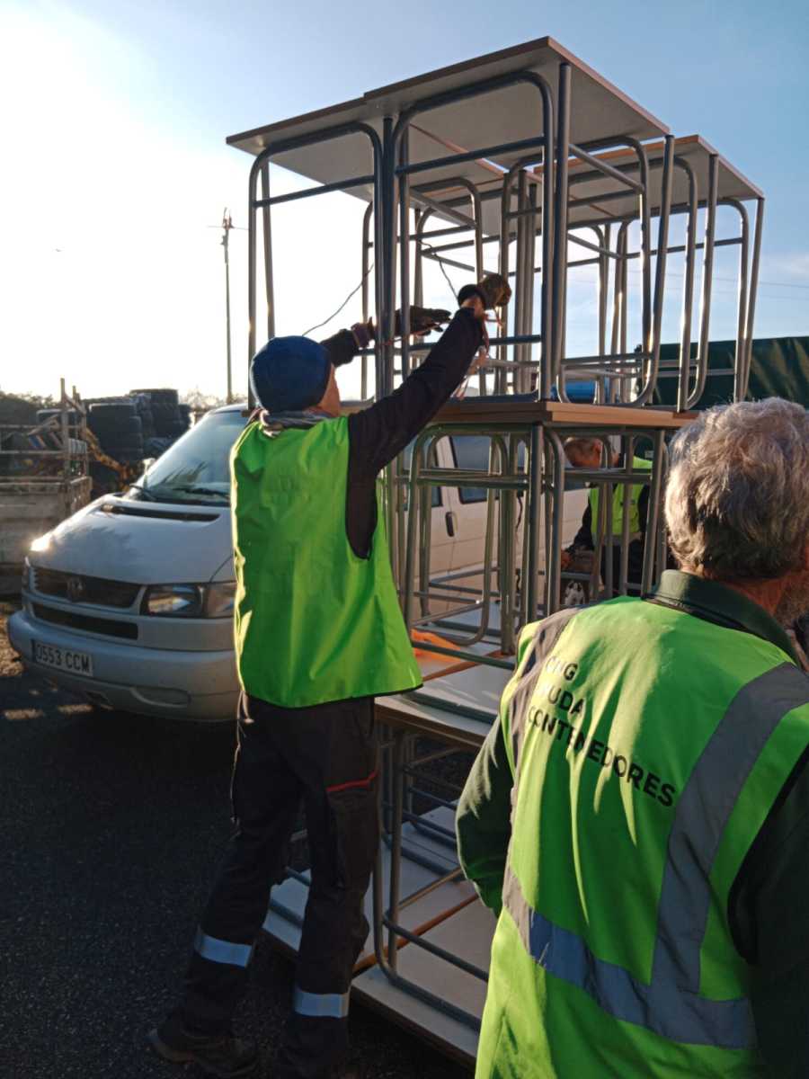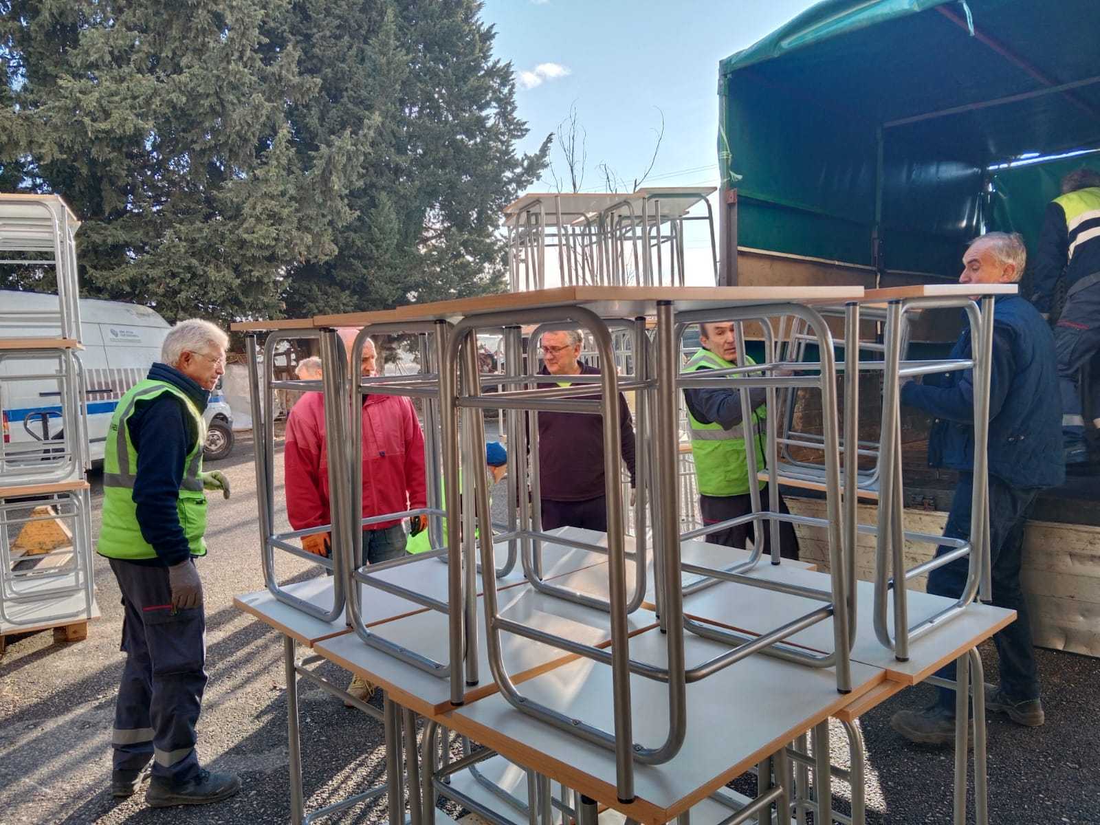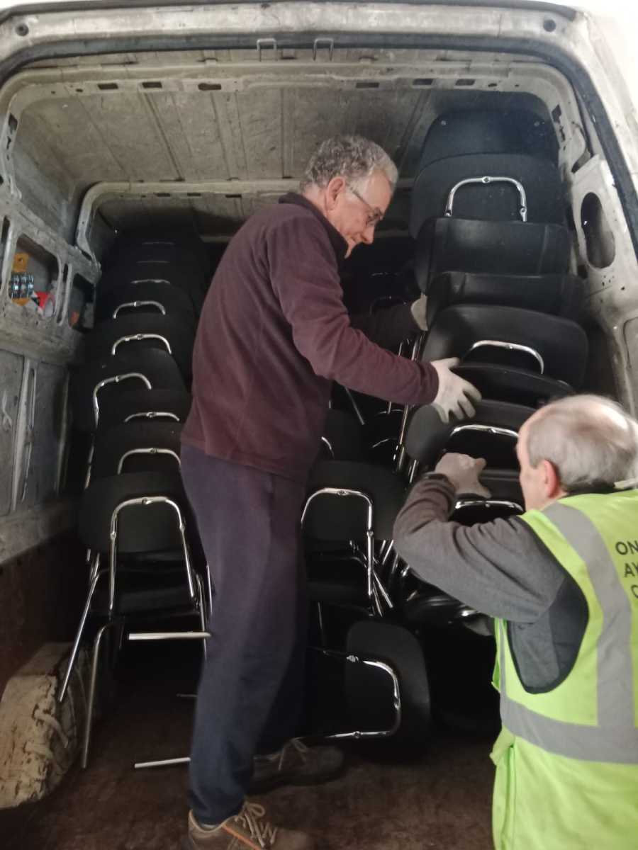 En la mañana del día 22 de diciembre de 2025, un grupo de voluntarios/as nos desplazamos hasta el aulario de la UPNA en el edificio de El Sario, de la Universidad Pública de Navarra, para hacernos cargo de una donación de 167 sillas y 95 pupitres procedentes de la Escuela de Idiomas.