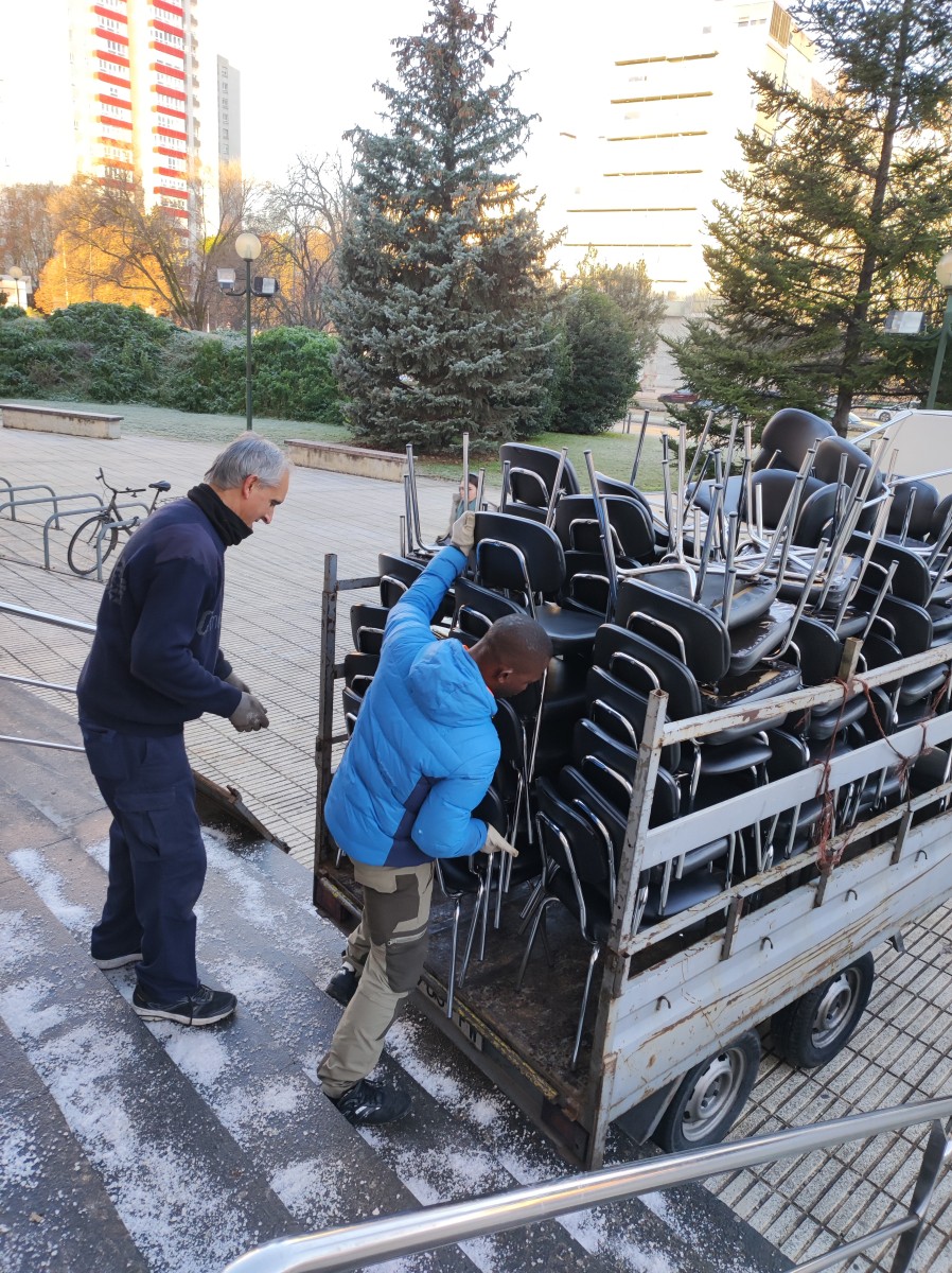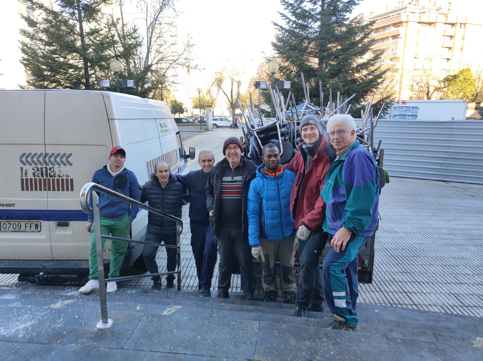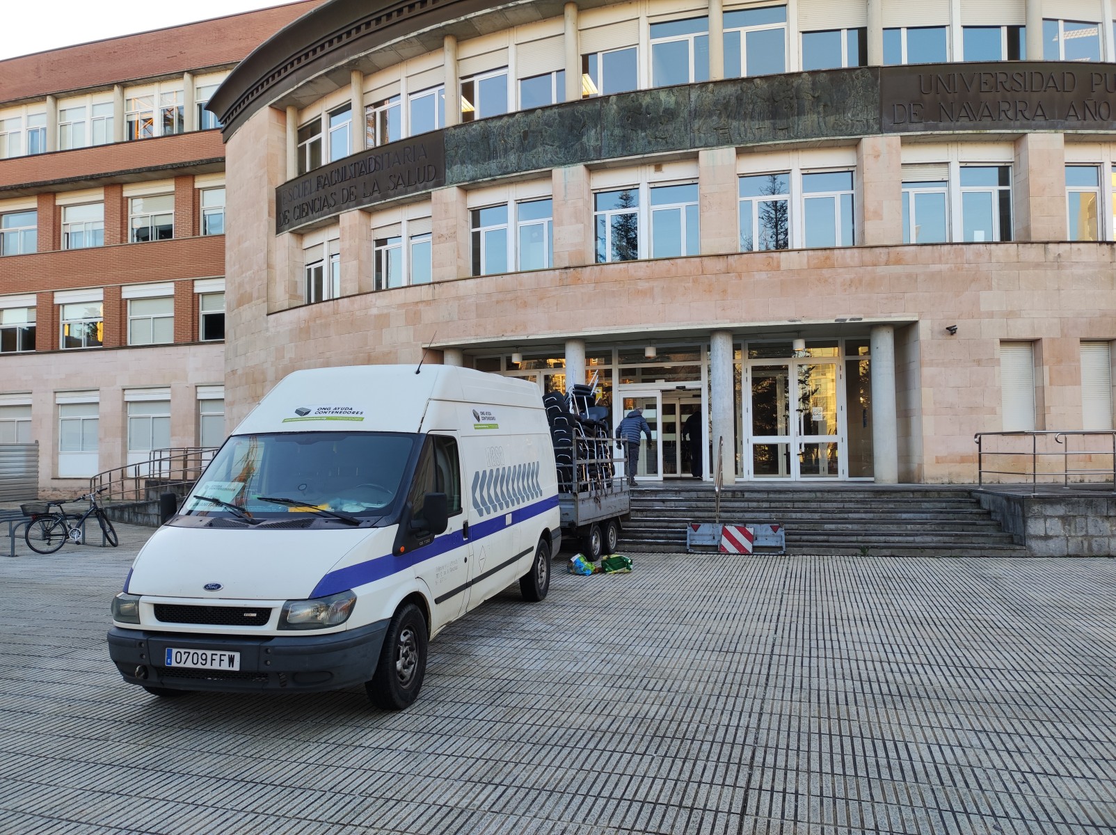En la mañana del día 27 de diciembre de 2023, un grupo de voluntarios/as nos desplazamos hasta el aulario de la UPNA y Edificio de El Sario, y otro grupo hasta la Escuela de Enfermería de la   Universidad Pública de Navarra para hacernos cargo de una donación de sillas de aula. Después de recoger la donación de las 685, las  trasladamos hasta nuestras instalaciones en Echavacoiz.