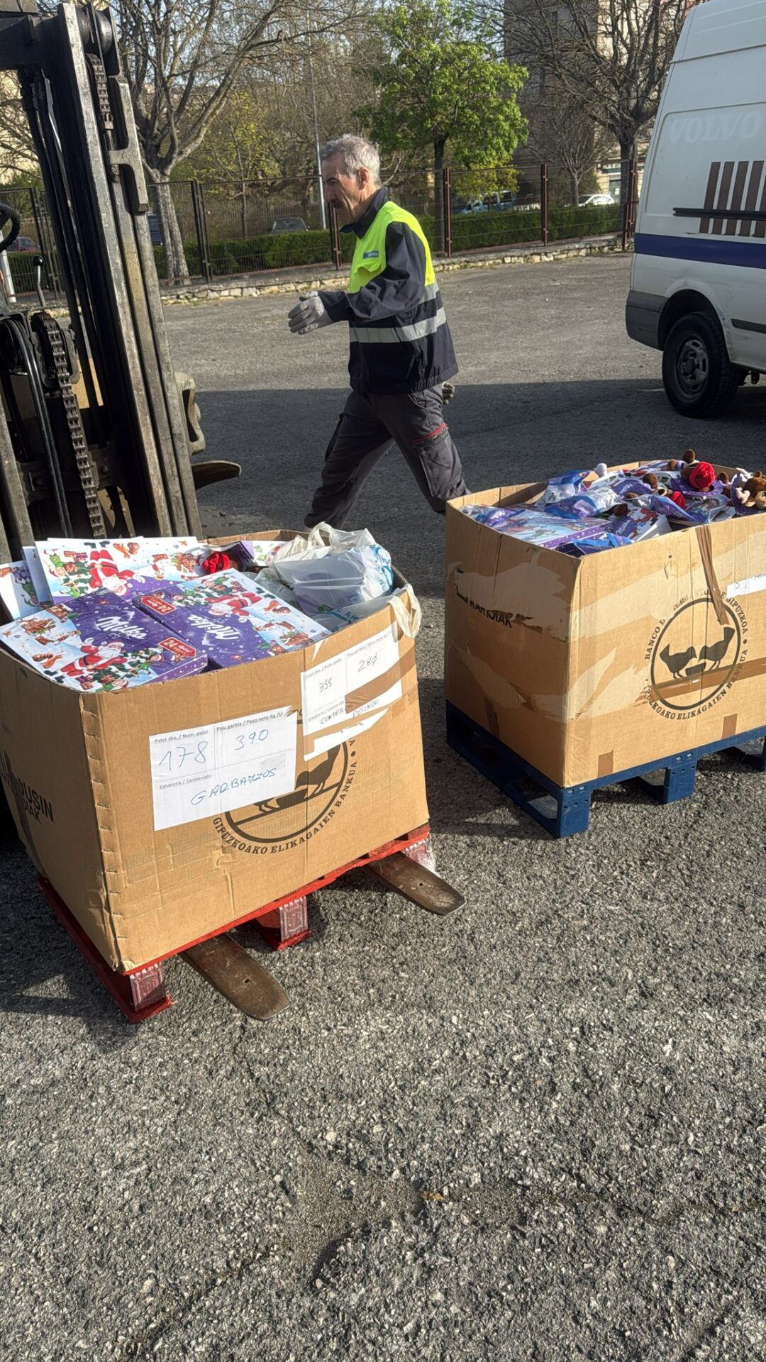 EL día 9 de abril de 2026 hemos recogido una donación del Banco de alimentos de Gipuzkoa en Bergara, consistente en dos palés de chocolates.