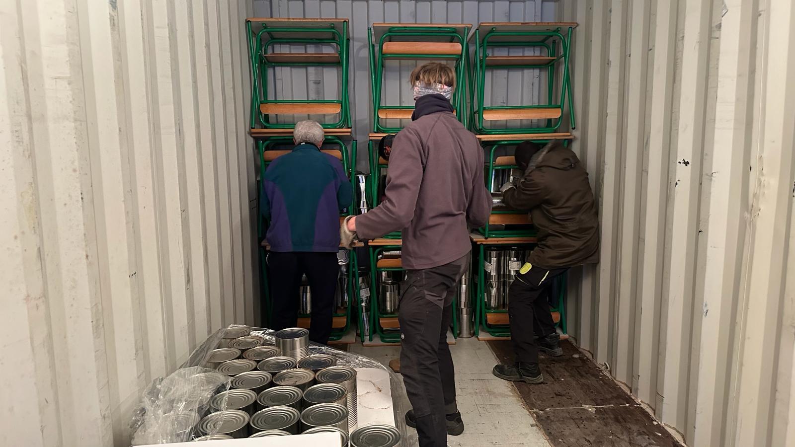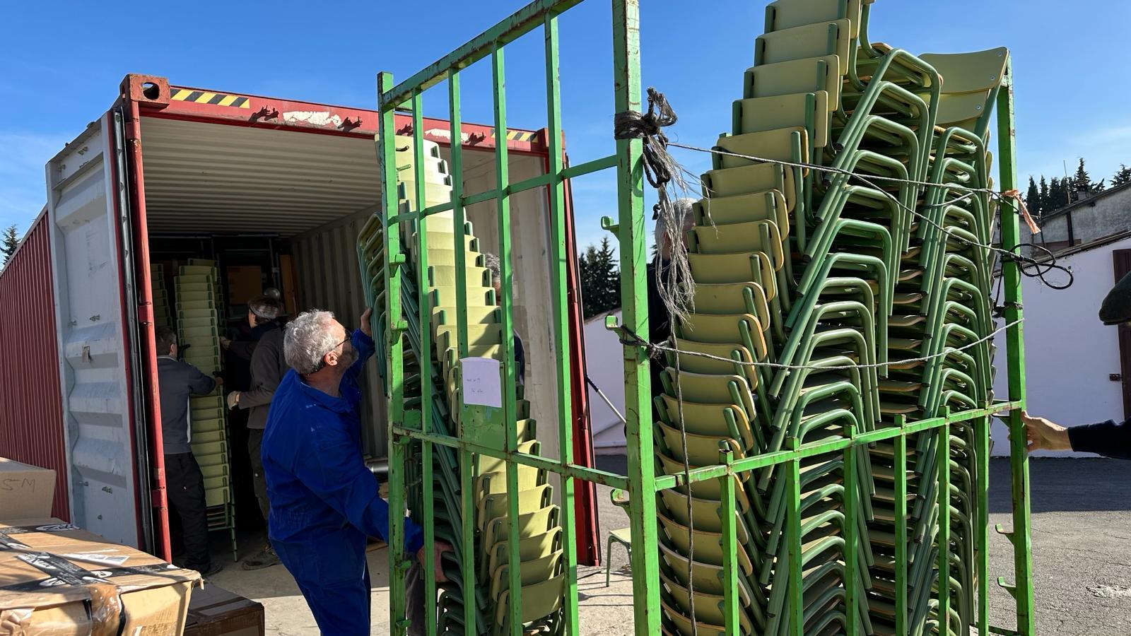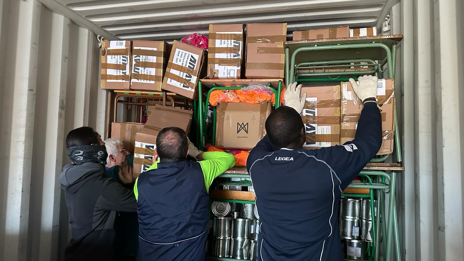 Entre los pupitres se han colocado alimentos, ordenadores, herramientas, materiales hospitalarios y otros materiales. Ha resultado una carga larga y muy laboriosa por el tipo de material cargado y la logística necesaria para el buen aprovechamiento del espacio.