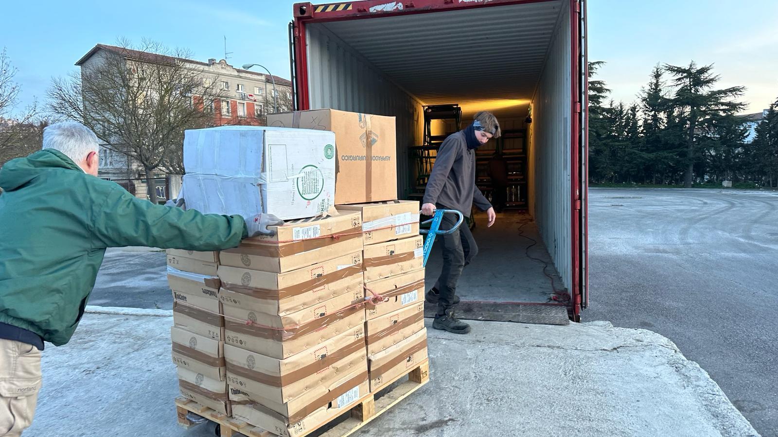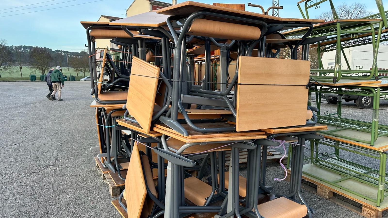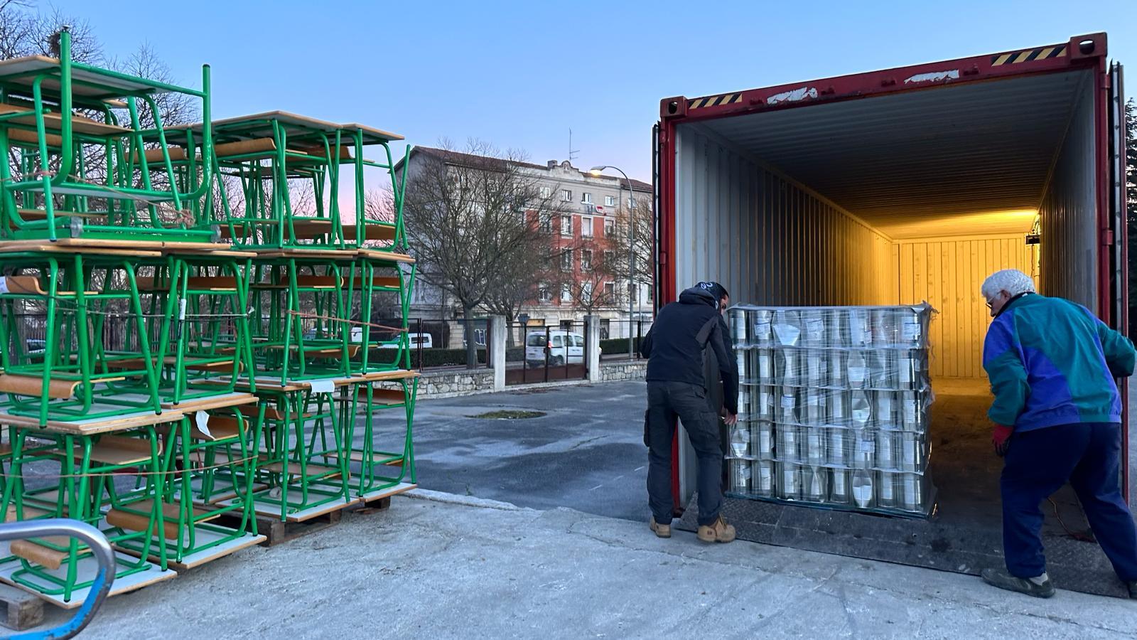 Entre los pupitres se han colocado alimentos, ordenadores, herramientas, materiales hospitalarios y otros materiales. Ha resultado una carga larga y muy laboriosa por el tipo de material cargado y la logística necesaria para el buen aprovechamiento del espacio.