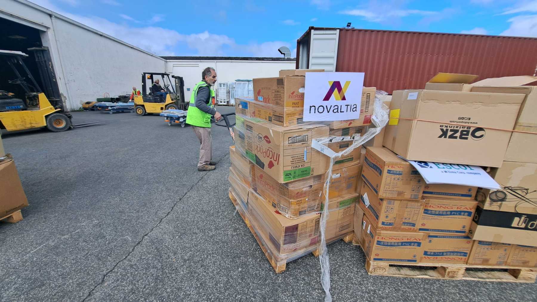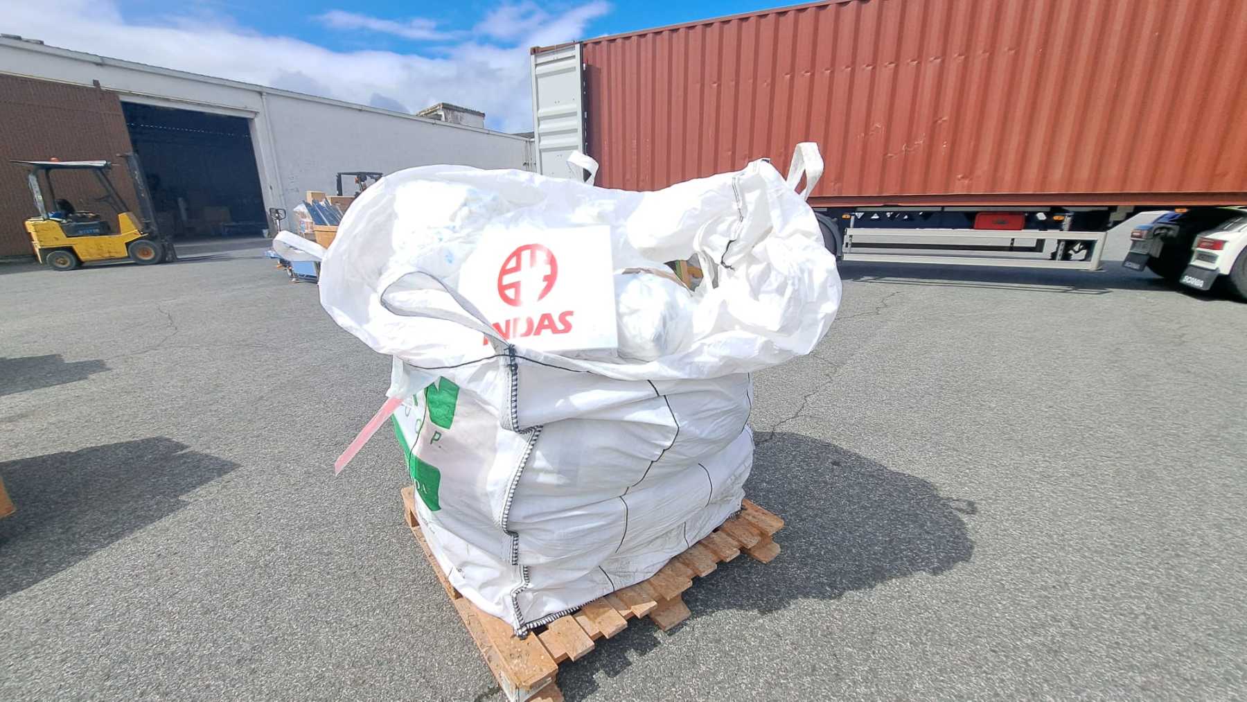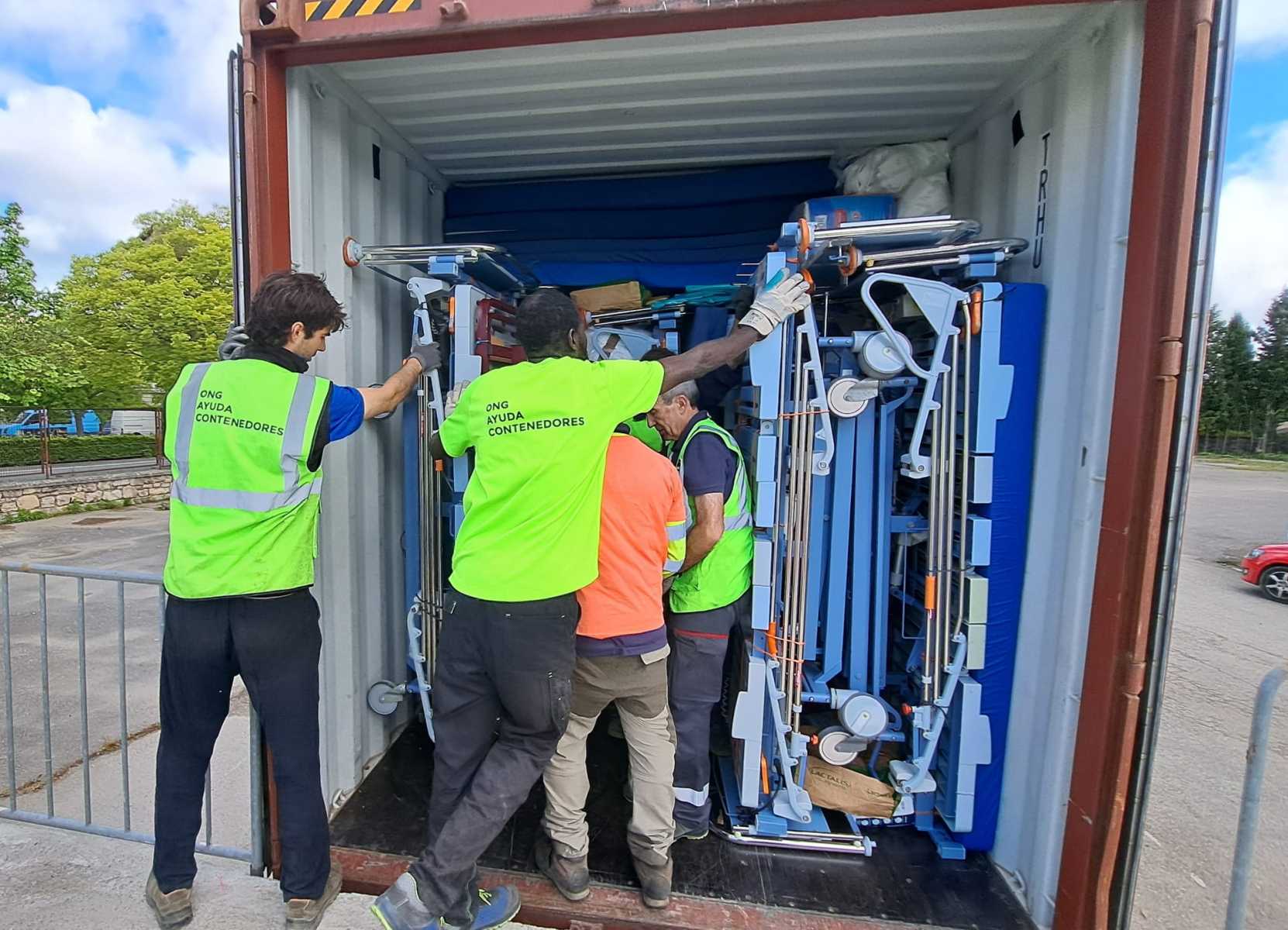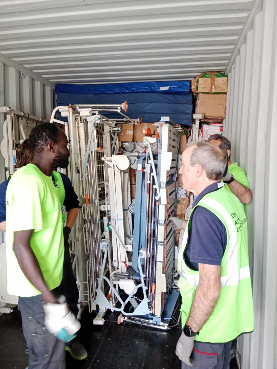 Este contenedor va repleto con 60 camas de hospital con sus colchones, potencias y goteros. Además todos los huecos se han rellenado con con pijamas, batas, sábanas, y elementos de higiene: compresas, pañales, empapadores…